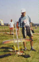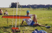 Leider waren wir die einzigen deutschen Teilnehmer - damit lag die ganze Last auf unseren Schultern Unsere Anreise gestaltete sich recht langwierig, weil wir von Berlin über Prag, Brno und Ostrava (also über die Tschechei) fuhren. So kamen wir dann erst spät in der Nacht vom Freitag zum Sonnabend an und es hieß nur noch: Zelt aufbauen und endlich schlafen... Am Sonnabend stand als erstes S6 auf dem Programm. Da wir in dieser Klasse nicht antraten, war noch Zeit für etwas Training: neue Modelle einfliegen, Teststarts... Schon früh am morgen war es ziemlich warm und im Laufe des Tages stiegen die Temperaturen dann irgendwohin - deutlich jenseits der 30º. Unsere Wasservorräte waren innerhalb kürzester Zeit erschöpft und die Bewegungen wurden auf das Nötigste reduziert. über Mittag wurde der Wind (thermisch - morgens und abends war es ja windstill) am stärksten und machte eine Verschiebung des S8E-Wettbewerbs um 1 Stunde erforderlich. Endlich konnte es doch losgehen - und was folgte, war der ungewöhnlichste S8E-Wettbewerb, den ich je erlebt habe: