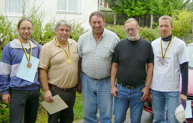 [vlnr.] Steffen Mieleh, Franz Weißgerber, Otto Nachtmann (Organisator und Mitflieger), Edi Söllner (Organisator und Wettbewerbsleiter) und Sascha Steinbeck Foto: ? |