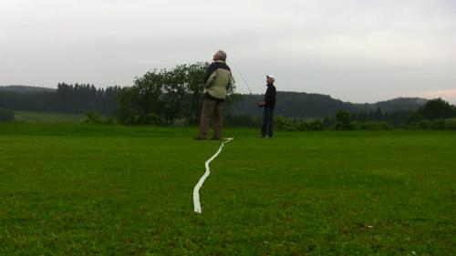 Sascha (rechts) fliegt gerade, Harald wird ihm helfen. Im Vordergrund die Messhilfe mit Metermarkierungen.