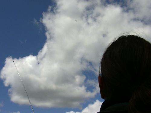 Hier fligt Steffen gerade, klein in der Luft ist sein Flieger zu sehen.