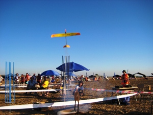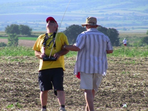 Während wir auf die Ergebnisse warteten, begann am Nachmittag der S8E/P-Wettbewerb, die funkferngesteuerten Raketengleiter mit Präzisionslandung, erstmalig im Kreismittelpunkt statt auf einer Landelinie. In dieser Klasse gab es in den letzten Jahren immer wieder zu Erfolgen, so verteten hier Deutschland der 4-malige Weltmeister Franz Weißgerber und zwei der drei amtierenden Mannschaftsvizeeuropameister Sascha Steinbeck und Manuel Mähl. |