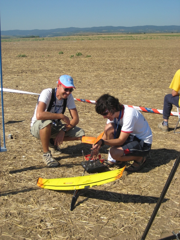 Manuel kontrolliert die Trimmung seines Modells kurz vor dem Start, Sascha gibt Hinweise